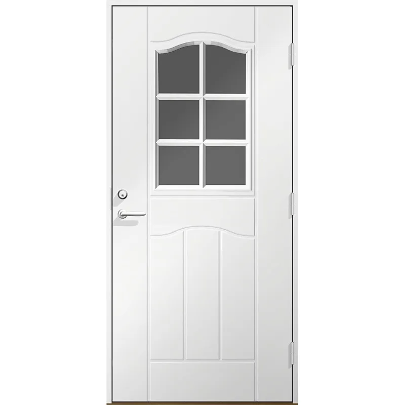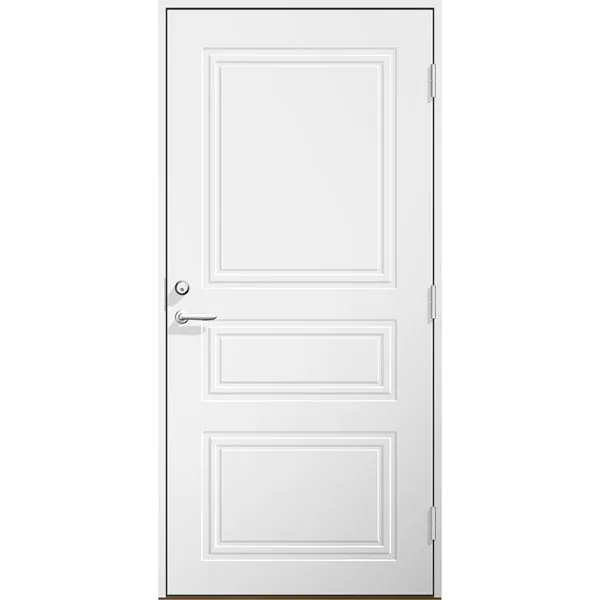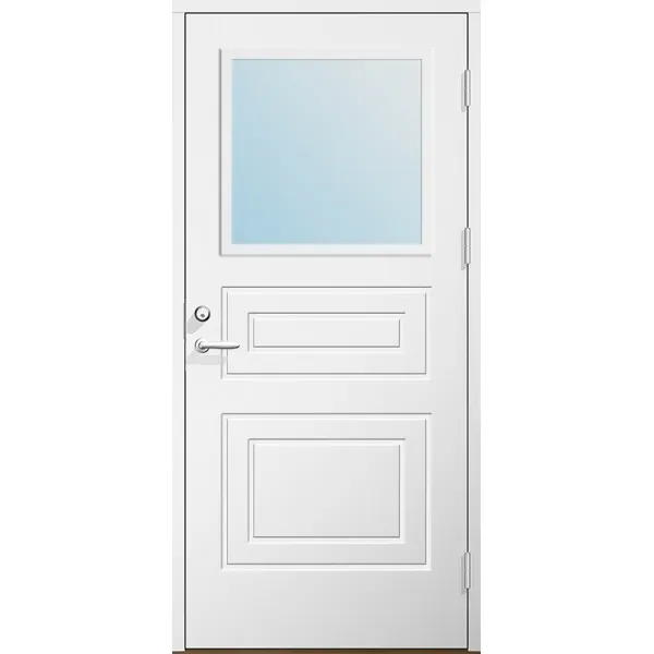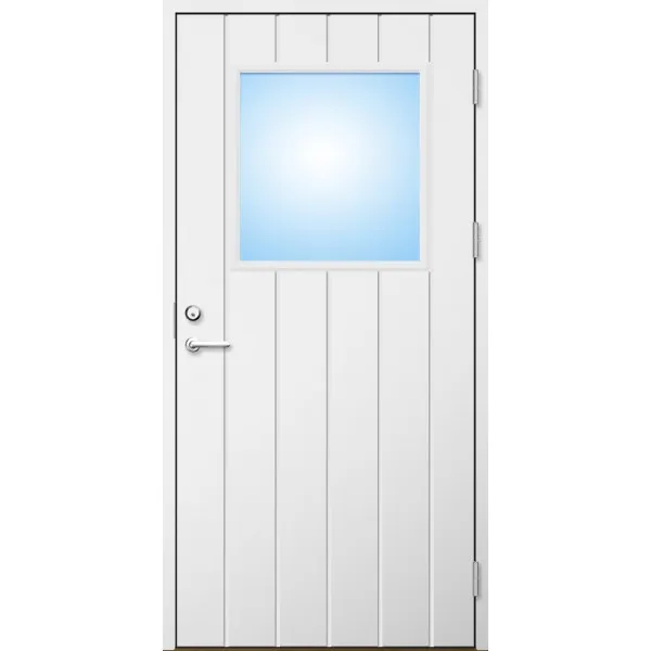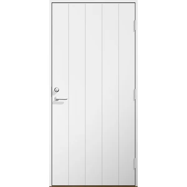 Den här klassiska ytterdörren med stående spårning har metallplåtsinlägg för ökad formstabilitet. Den vitmålade dörren håller värmen väl inne med sitt låga U-värde och passar till de flesta hus. Dörren är byggd för att hålla länge med sin dubbelfalsade konstruktion.