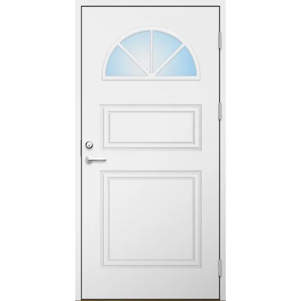 Den här stilfulla ytterdörren med spårade speglar och elegant halvmånefönster kommer i 21 graders utförande – vår kraftigaste konstruktion. Med ett tjockt dörrblad på 69 mm, dubbla aluminiumplåtar och 60 mm isolering erbjuder dörren utmärkt hållbarhet och värmeisolering.