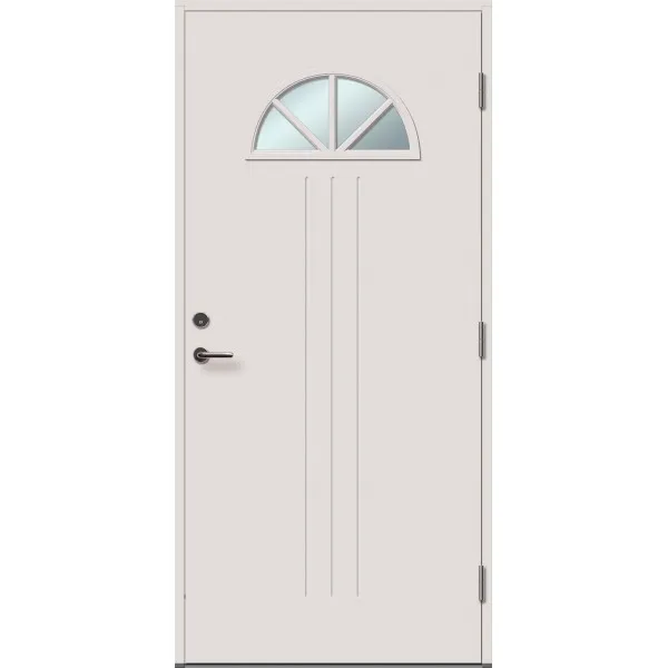 Denna vackra ytterdörr kombinerar elegant design med praktisk funktion genom sitt stilfulla halvmåneglas och stående centrerad spårning. Med metallplåtsinlägg erbjuder dörren överlägsen formstabilitet och hållbarhet över tid. Den klassiska designen med halvmånefönster passar utmärkt till både traditionella och moderna hem, där den utgör ett inbjudande blickfång.