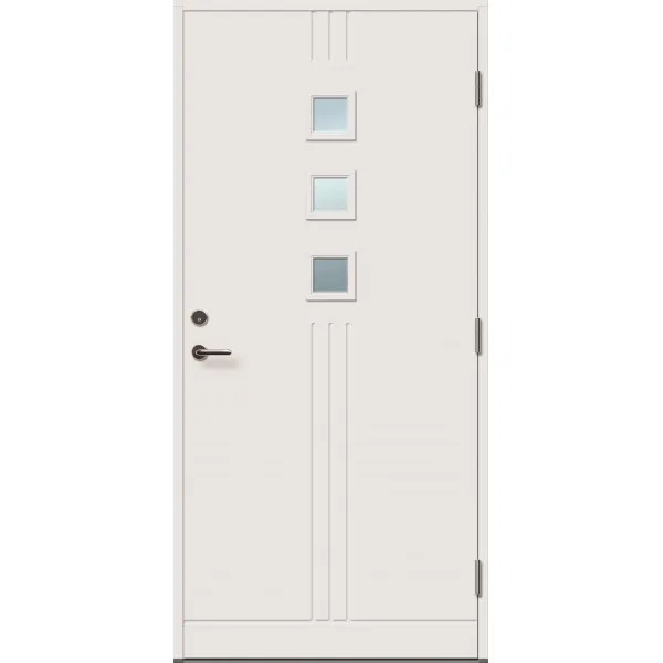 Denna vackra ytterdörr utmärker sig med sina tre centrerade kvadratiska glas och matchande stående spårning som skapar en modern och samtidigt tidlös design. Med metallplåtsinlägg får dörren överlägsen formstabilitet och hållbarhet över tid. Den eleganta kombinationen av glas och spårning ger ett stilfullt intryck som passar många olika hustyper.