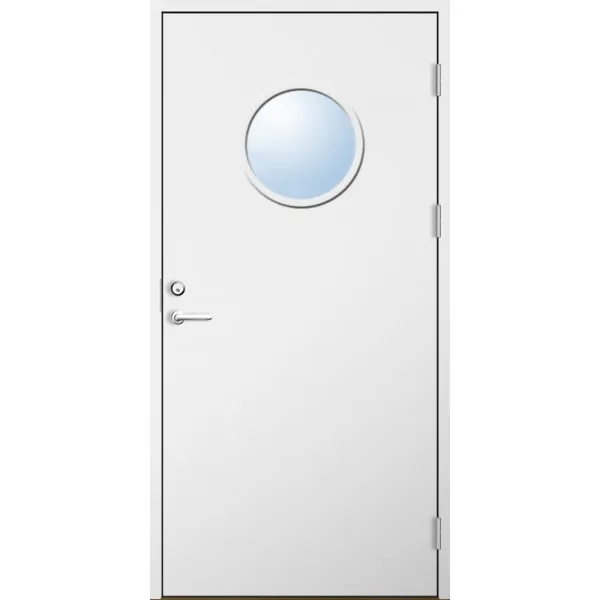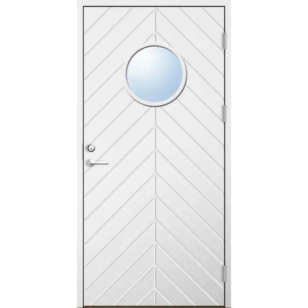 Den här moderna ytterdörren med slät yta och runt glasparti tillverkas i 21 graders utförande – vår kraftigaste konstruktion. Med ett tjockt dörrblad på 69 mm, dubbla aluminiumplåtar och 60 mm isolering ger dörren utmärkt hållbarhet och värmeisolering.