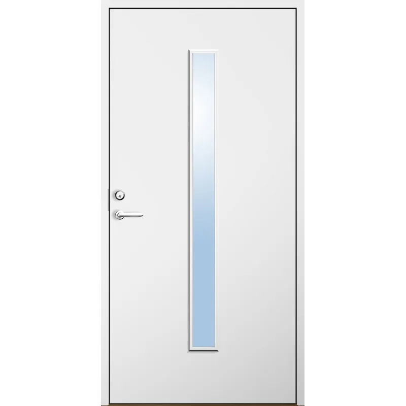 Den här moderna inåtgående ytterdörren med slät yta och centrerat glas i funkisstil kombinerar klassisk design med nutida funktionalitet. Med ett tjockt dörrblad på 69 mm, dubbla aluminiumplåtar och 60 mm isolering erbjuder dörren utmärkt hållbarhet och värmeisolering. Tillverkad i vår lokala moderna fabrik i Osby garanterar vi högsta kvalitet.